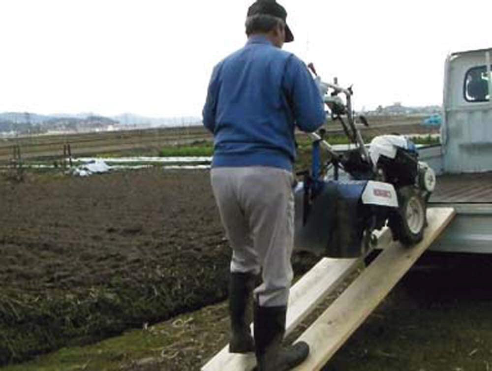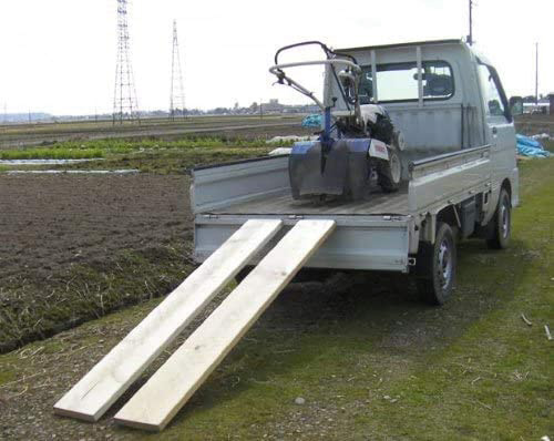 耕運機や農機具などの軽トラックへの積み降ろしに。木板を取付けて使用します。使用木板は、厚さ約38mm、長さ約1800mmのフシ、割れ、ヒビが少ない丈夫な板をご使用下さい。