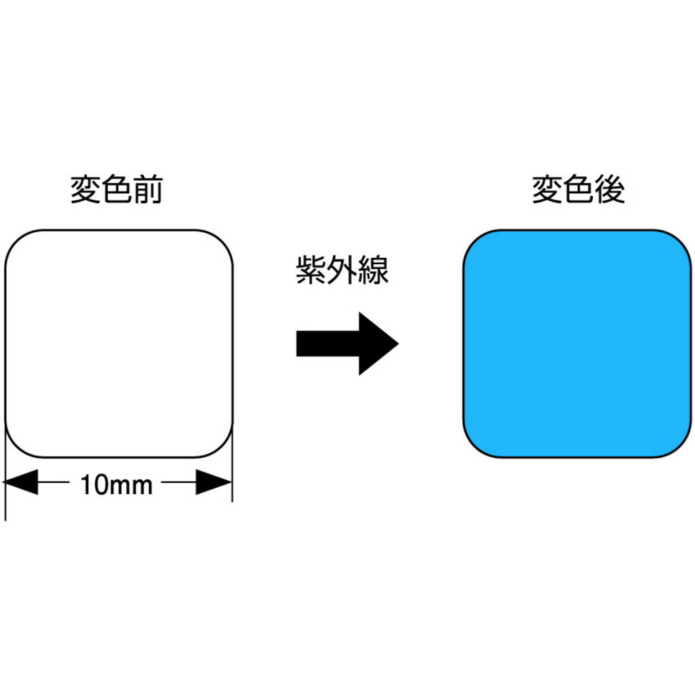 紫外線が照射されると、積算照射量に応じて白色→青色に徐々に変色します。