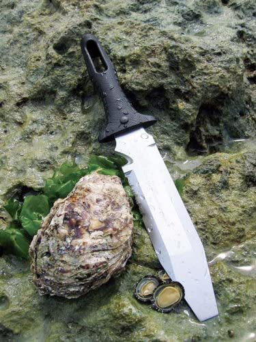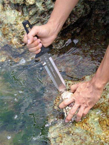 ■チゼル型刀身は岩に張り付いた貝類などの剥ぎ取り、コマセなどの粉砕に便利です。