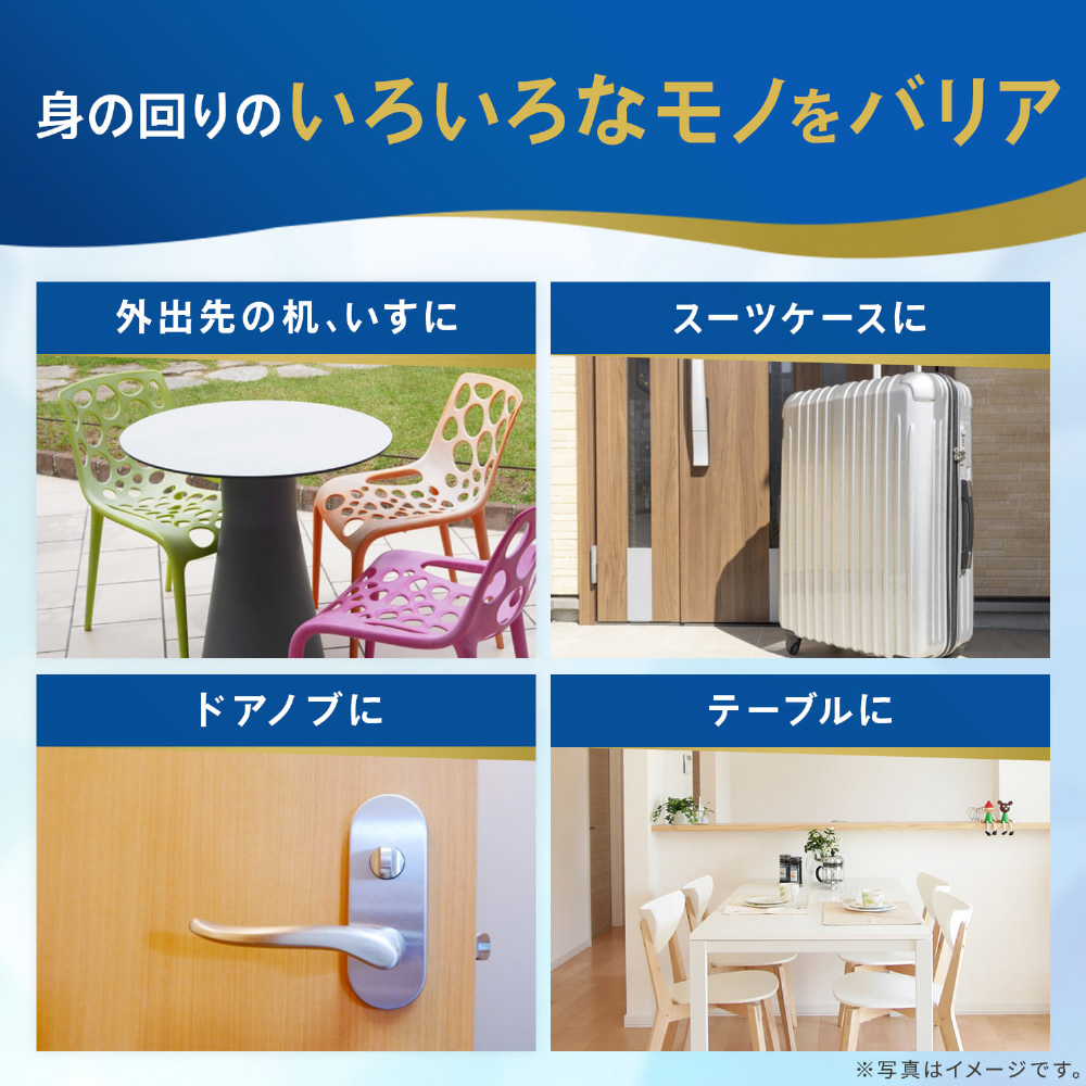 身の回りのものをひと拭きで除菌・抗菌するアルコールタイプのウエットシートです。抗菌作用が1週間持続します。