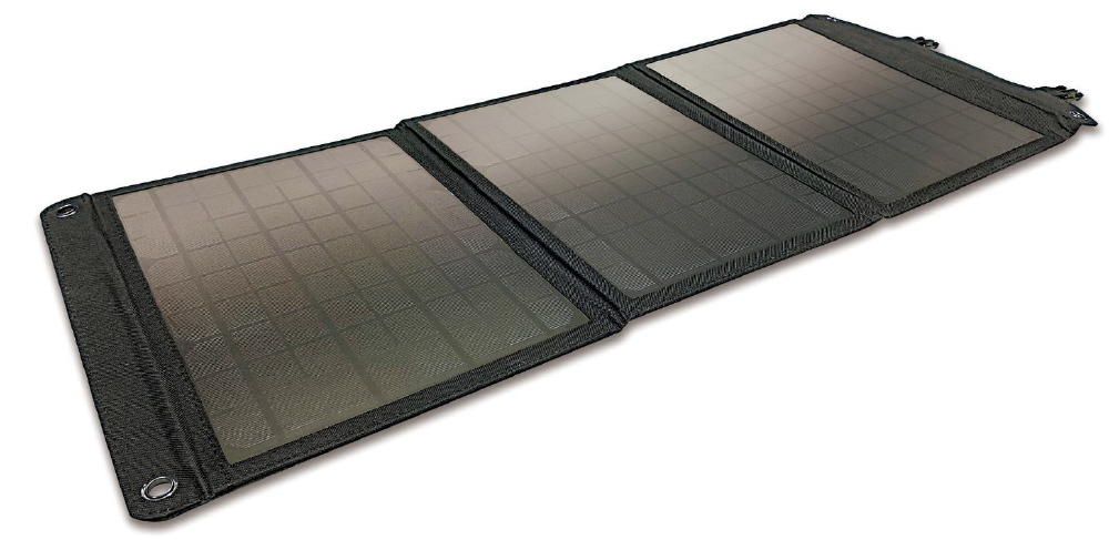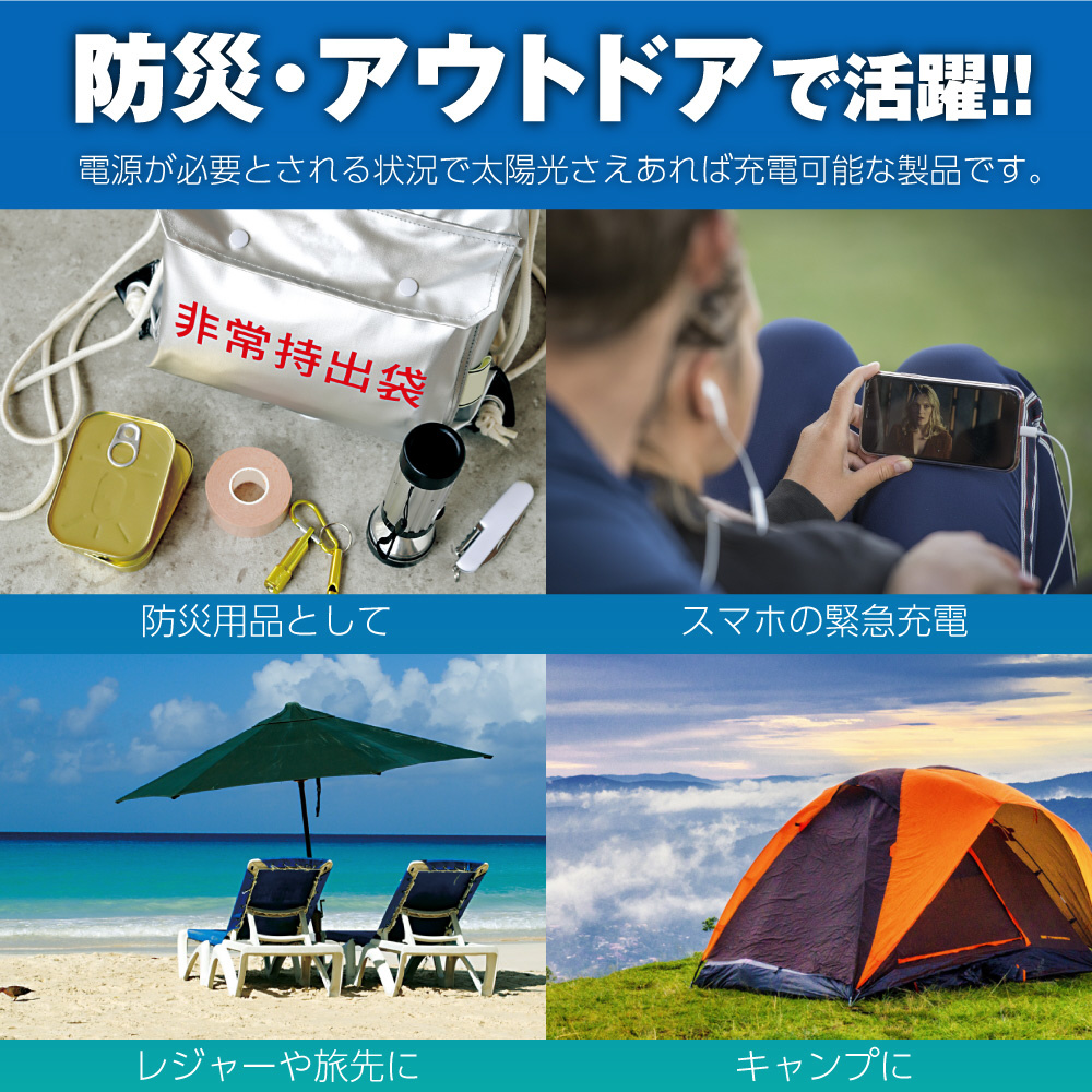 キャンプ・防災に役立つソーラー充電器。晴れていれば電源がとれないアウトドアで活躍します。