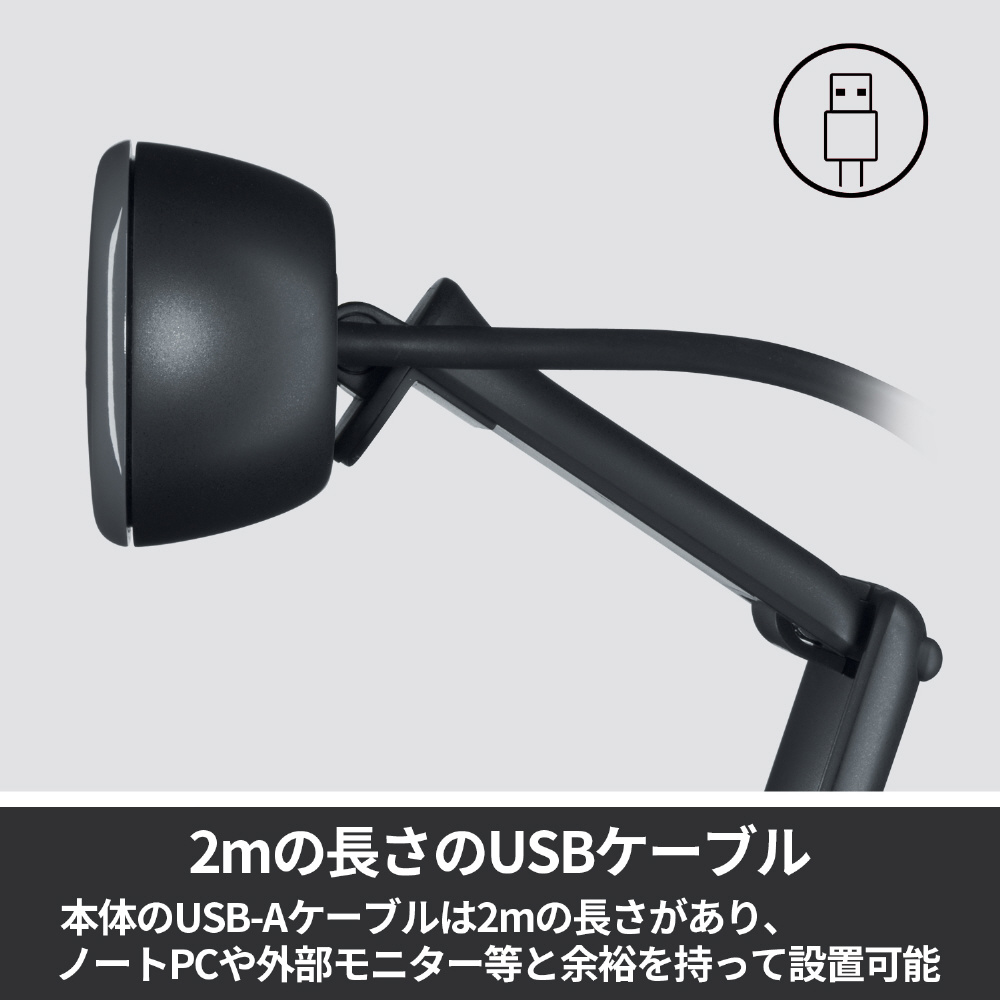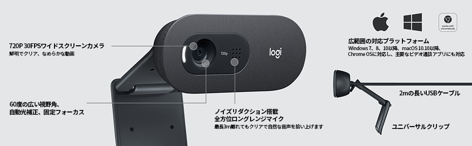 通常より長い2メートルのUSBケーブルとユニバーサルクリップを備えたC505は、多目的に使用できる幅広い取り付け方法を提供します。ノートPCや外部モニター・ディスプレイにしっかりと設置したり、クリエイティブな方法で、PCから最大2メートル離れた棚や固定具に取り付けたりすることができます。