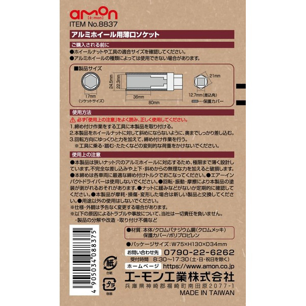 | 商品名 | 8837 アルミホイール用薄口ソケット(キズ防止カバー付) 17mm 差込角サイズ12.7mm |