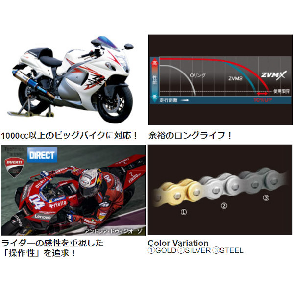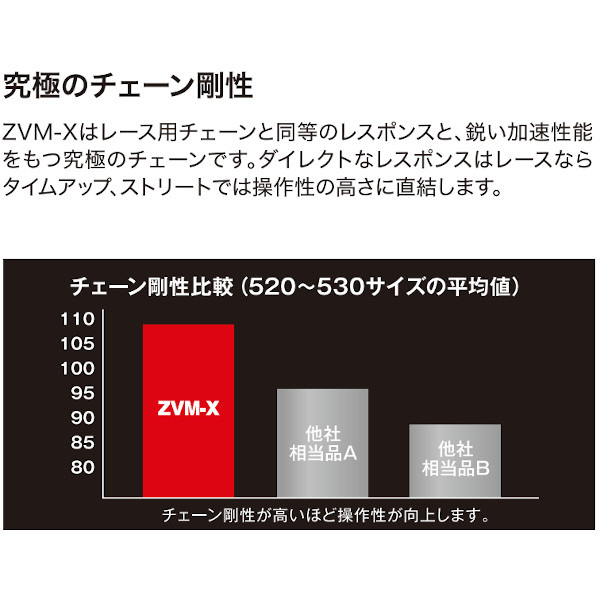 ZVM-Xは剛性指数を旧モデルZVM2より約10%向上。レース用チェーンと同様のレスポンスと、鋭い加速性能をもつ究極のチェーンです。ダイレクトなレスポンスはレースならタイムアップ、ストリートでは操作性の高さに直結します。