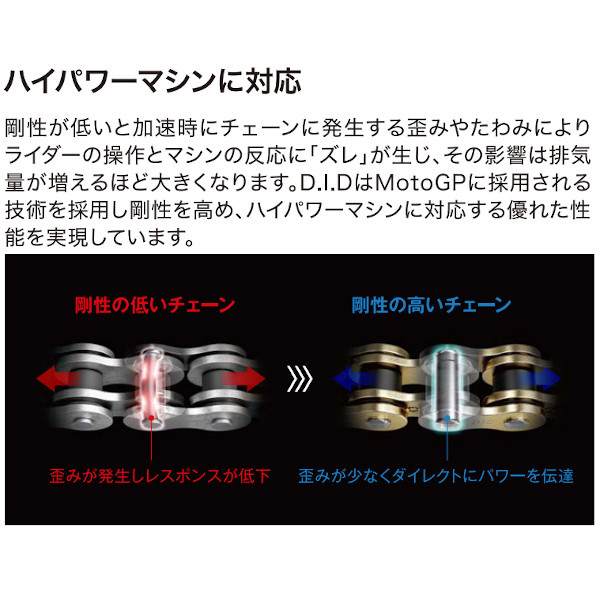剛性が低いと加速時にチェーンに発生する歪みやたわみによりライダーの操作とマシンの反応に「ズレ」が生じ、その影響は排気量が増えるほど大きくなります。D.I.DはMotoGPに採用される技術を採用し剛性を高め、ハイパワーマシンに対応する優れた性能を実現しています。