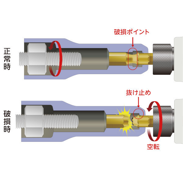 ●ビットがソケット内部で折れ、折れたビットが抜け止めになるKTC独自の「難攻不落機構」を採用しました。