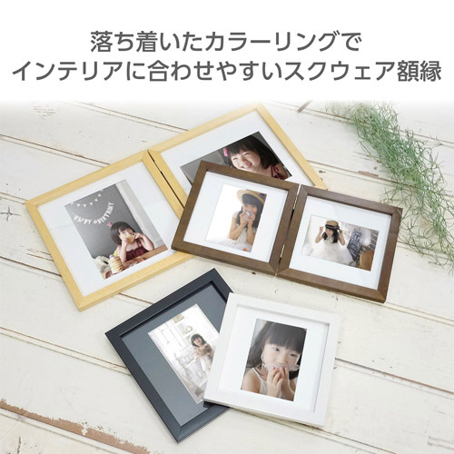 落ち着いたカラーリングと直線的でシンプルな額縁のデザインで、お部屋のコーディネートに合わせやすいスクウェア額縁。マット紙の向きを替えれば、タテ・ヨコどちらの向きの写真にも使用できます。