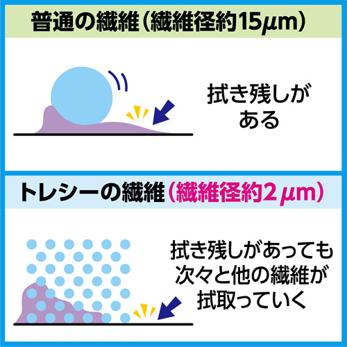 トレシーの超極細繊維(約2μm)が拭き取り面に密着し、「ミクロポケット」(繊維の隙間)に汚れを取り込み除去します。吸水性にすぐれ、水や油をすばやく吸い上げます。