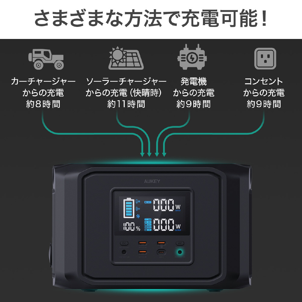 全ポート同時に使用することができます。ポート合計では650Wまで出力可能です。別売のアクセサリを使用すれば本体のソーラー充電も可能ですので、停電時にも製品本体を充電することが可能です。