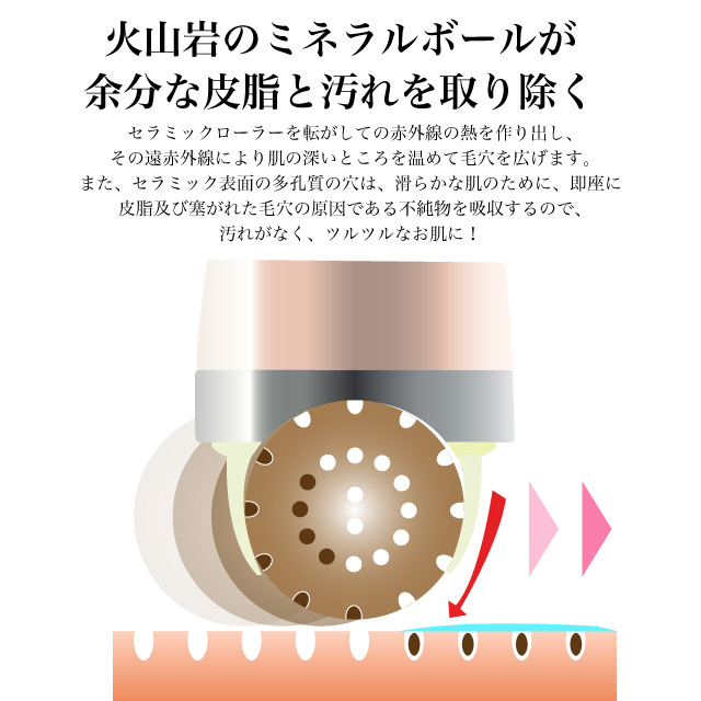 セラミックローラーを転がしての赤外線の熱を作り出し、その遠赤外線により肌の深いところを温めて毛穴を広げます。