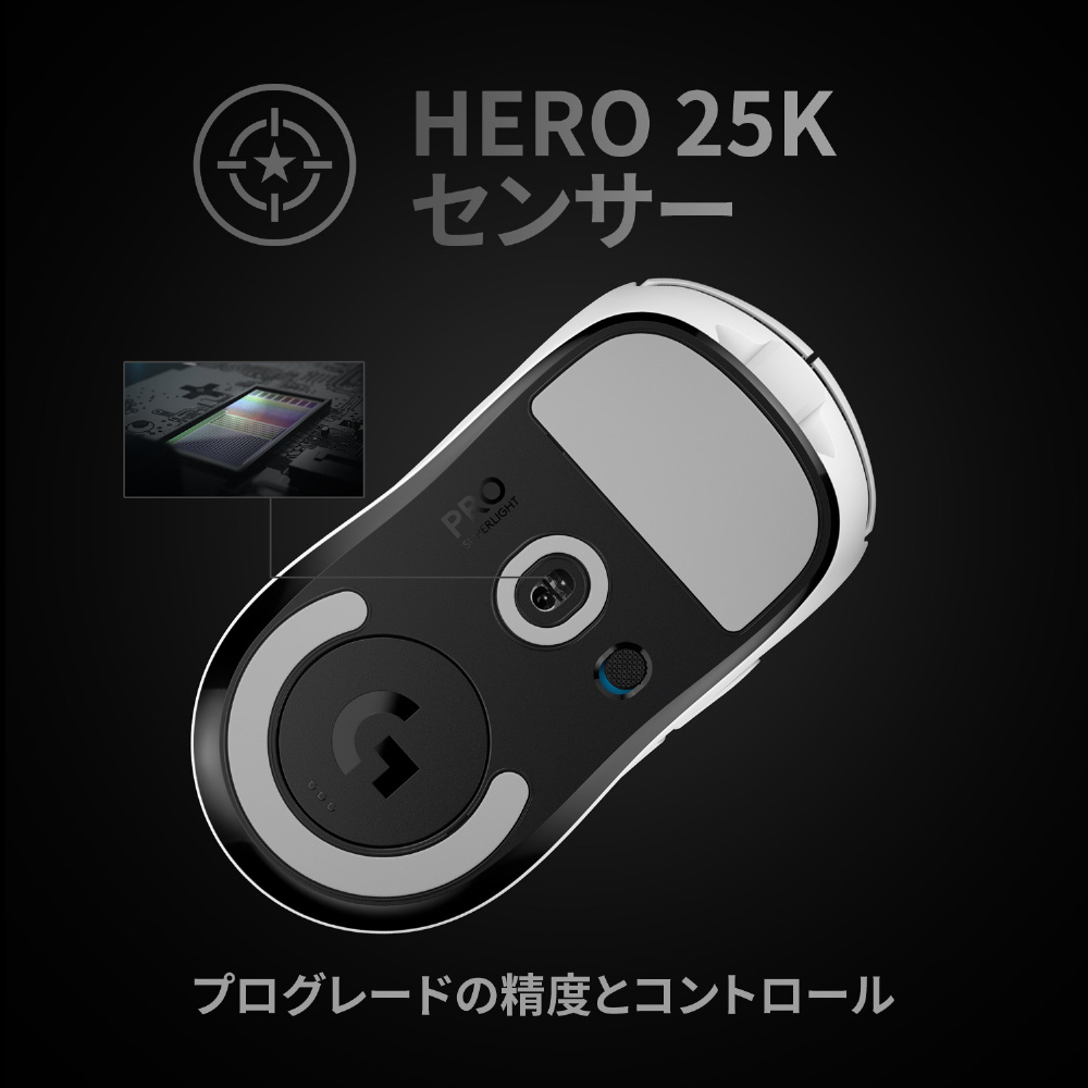 「PRO X SUPERLIGHT」は人気を博している「PROワイヤレスゲーミングマウス」の形状を継承しながら、本体重量63gと「ロジクールG」ワイヤレスマウス史上最軽量を実現しており、高性能ワイヤレステクノロジー「LIGHTSPEED」による遅延のない安定し信頼できる接続を提供すると同時に、サブミクロンレベルの動きまで精確に捉える「HERO 25K」マウスセンサーを搭載しています。