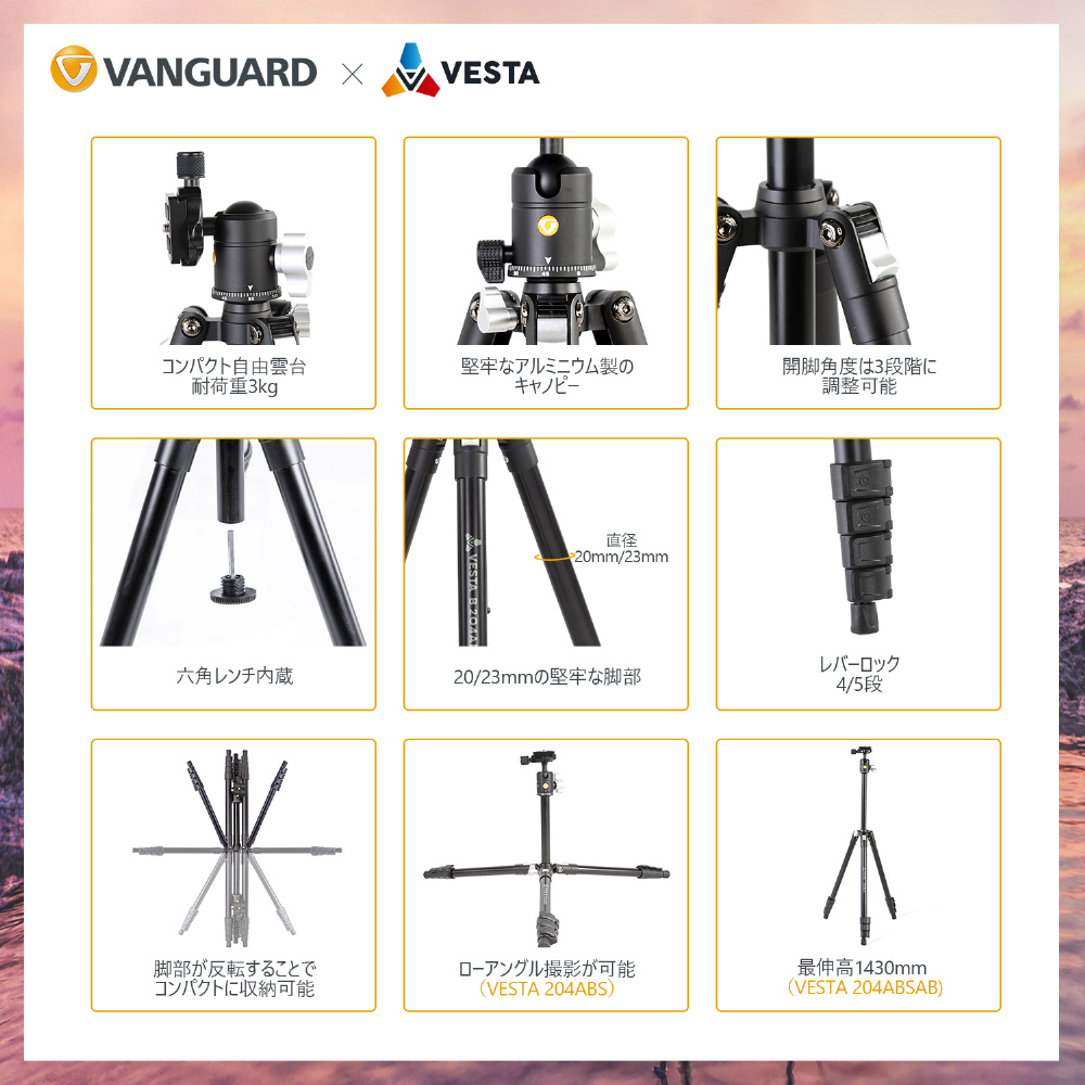 VESTA FB 204ABは、軽量、超コンパクトで実用性に優れたアルミニウム製トラベル三脚キット。携帯性を最大限に高めるように設計され、ミラーレスカメラキットに適しています。