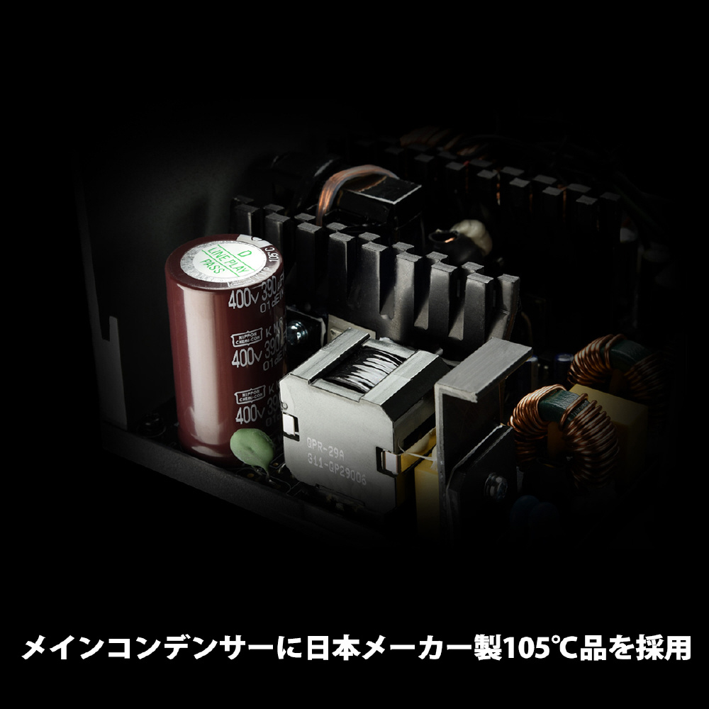 80PLUSブロンズ認証取得、優れた変換効率は電源内部の発熱を抑え、耐久性の向上や電気代の節約につながります。