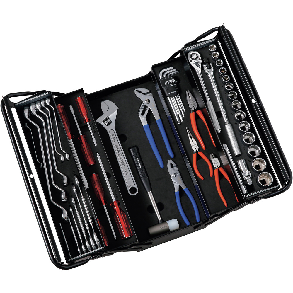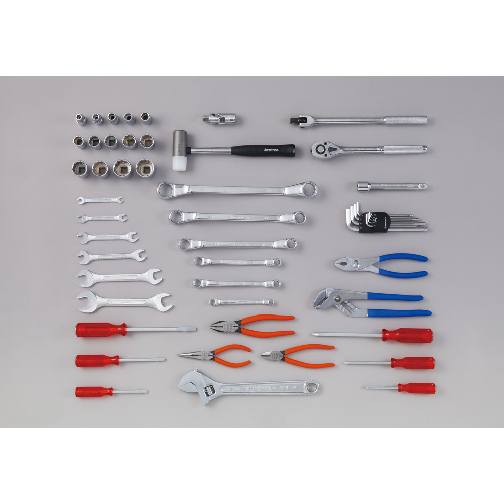 ■ソケット: 8・10・12・13・14・17・19・21・22・24・26・27・30・32、ラチェットハンドル、ナットスピンナハンドル、エクステンションバー、ユニバーサルジョイント、両口めがねレンチ: 810・1113・1214・1719・1922・2427、両口スパナ: 67・810・1113・1214・1719・2224、貫通角軸ドライバー: -75・-100・-150・+No.1・+No.2・+No.3、モンキレンチ、コンビネーションプライヤ、ウォーターポンププライヤ、ペンチ、ラジオペンチ、ニッパ、ロングボールポイント六角棒レンチ: 1.5・2・2.5・3・4・5・6・8・10、コンビネーションハンマー、ツールケース