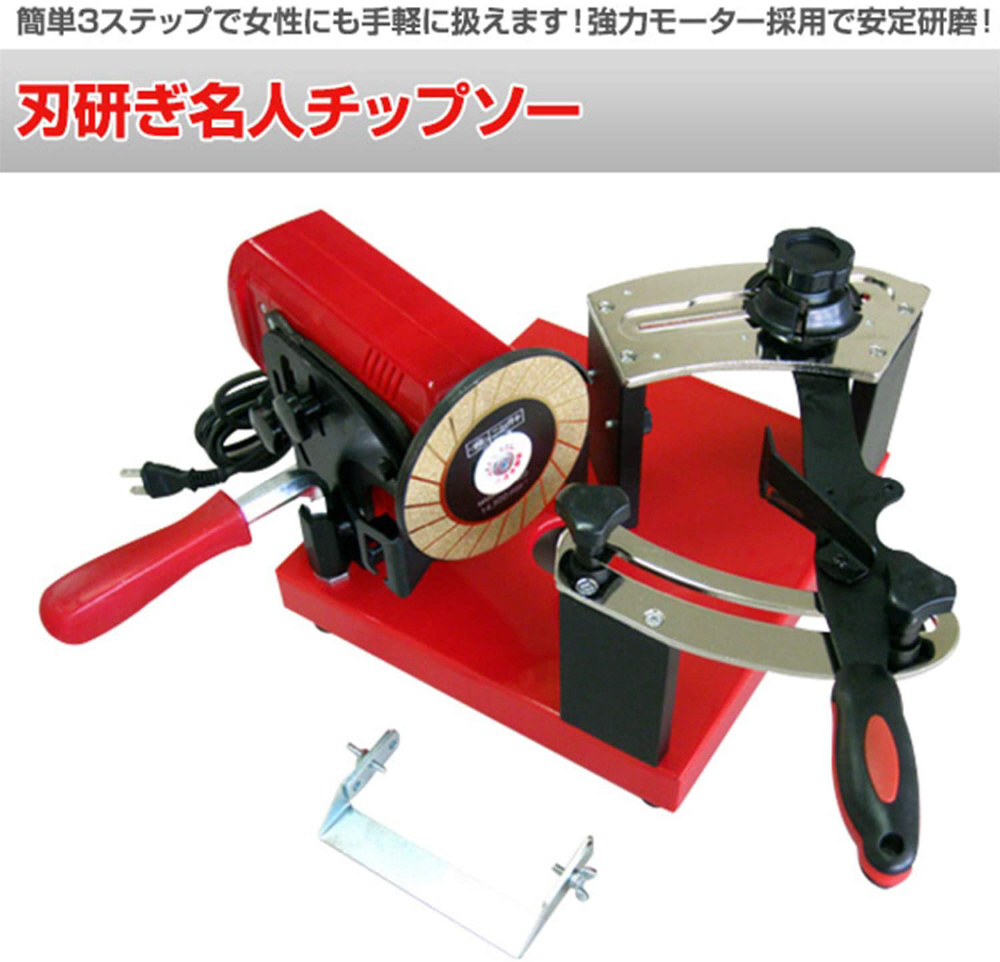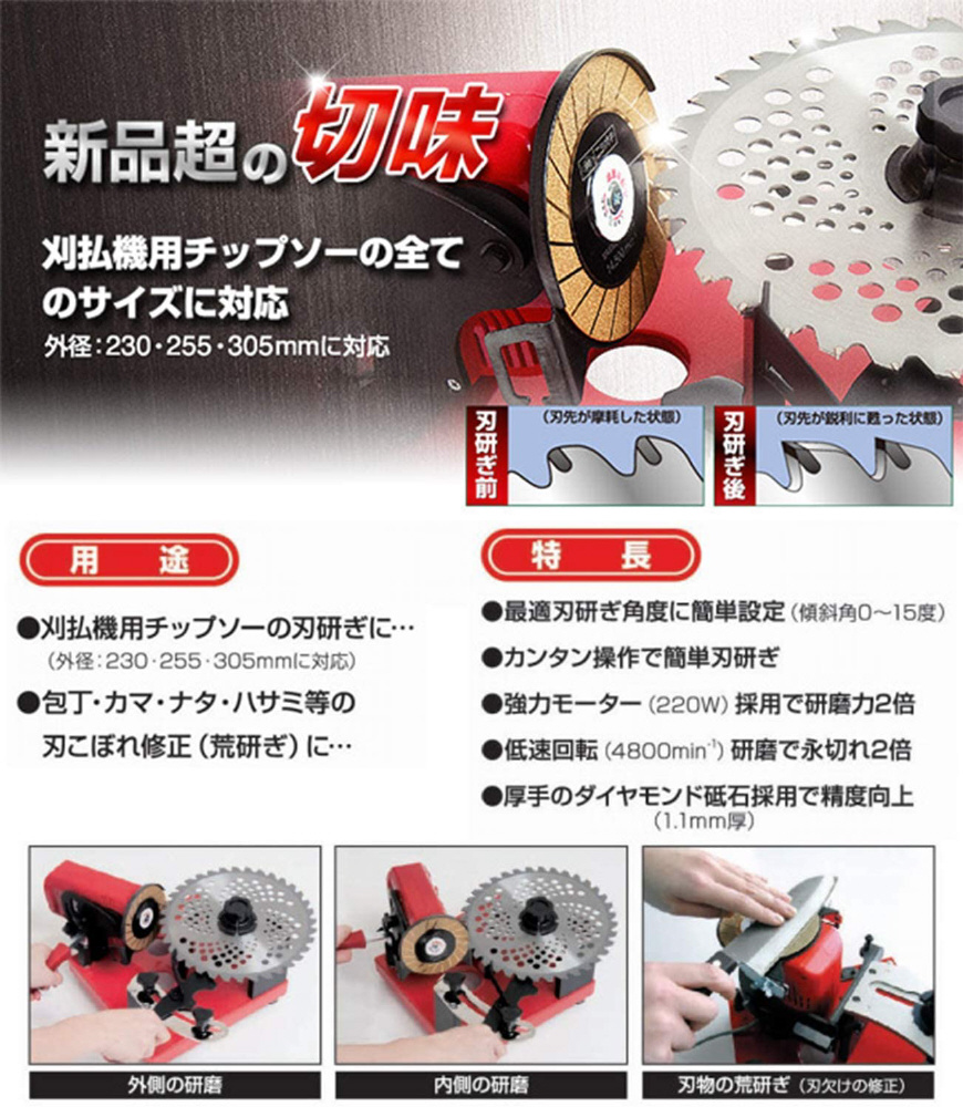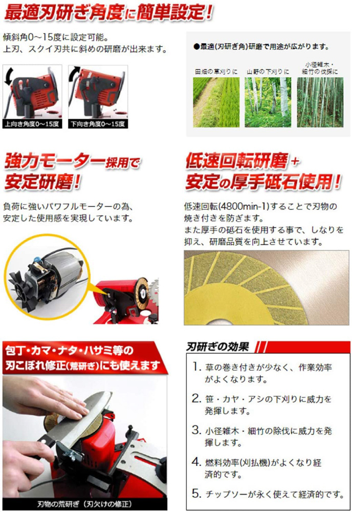 刈払機用チップソーの刃研ぎに最適!強力モーター採用で安定研磨!低速回転研磨+安定の厚手砥石使用!包丁・鎌・鉈・ハサミ等の刃こぼれ修正(荒研ぎ)にも使えます。