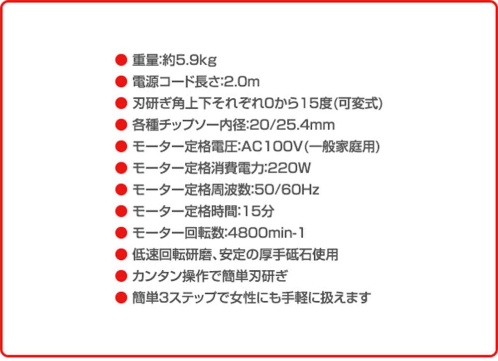 研磨可能チップソーサイズ 刈払機用チップソー:外径230/255/305mm 各種チップソー内径:20/25.4mm。刃研ぎ角:上下それぞれ0から15度(可変式)。モーター定格電圧:AC100V(一般家庭用)。モーター定格消費電力:220W。モーター定格周波数:50/60Hz。