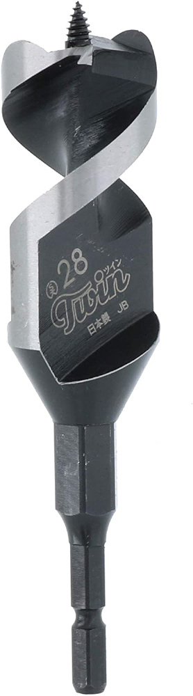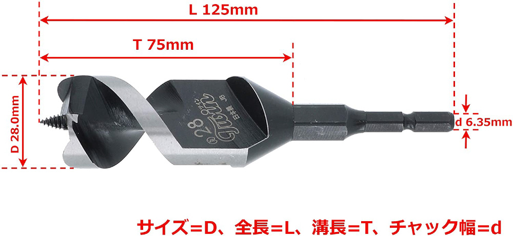 ケガキ刃: 2枚刃で負荷を半分に。スクイ刃: 2枚刃+少し斜めにして負荷を軽減。先ネジ: 小さくし負荷を軽減。ラセン: 木屑の詰まりを軽減。6角軸(6.35mm): インパクトドライバーに装着可能。穴径サイズ: 28mm。全長: 125mm 有効長: 75mm。適用機種;インパクトドライバー(14.4V以上)、ドリルドライバー(14.4V以上)。