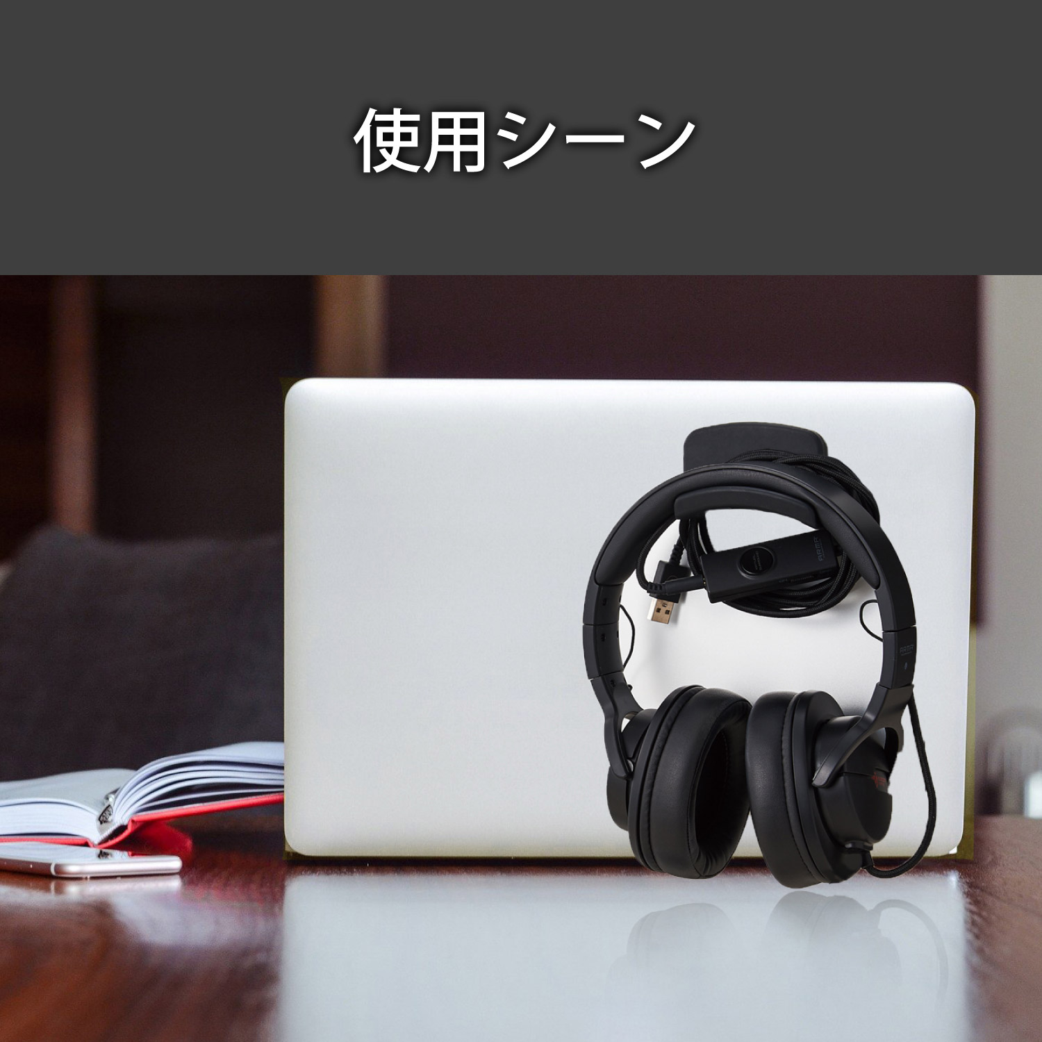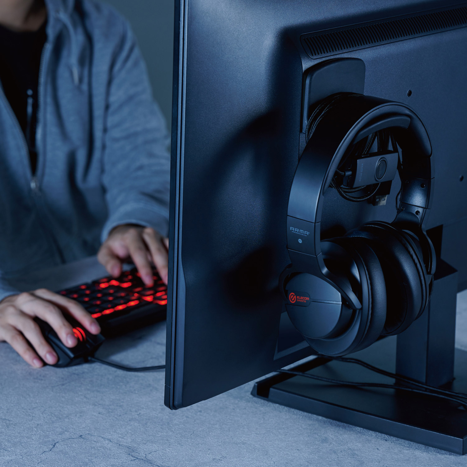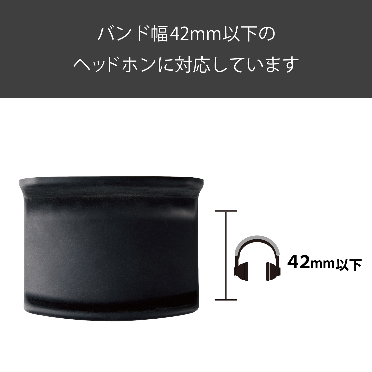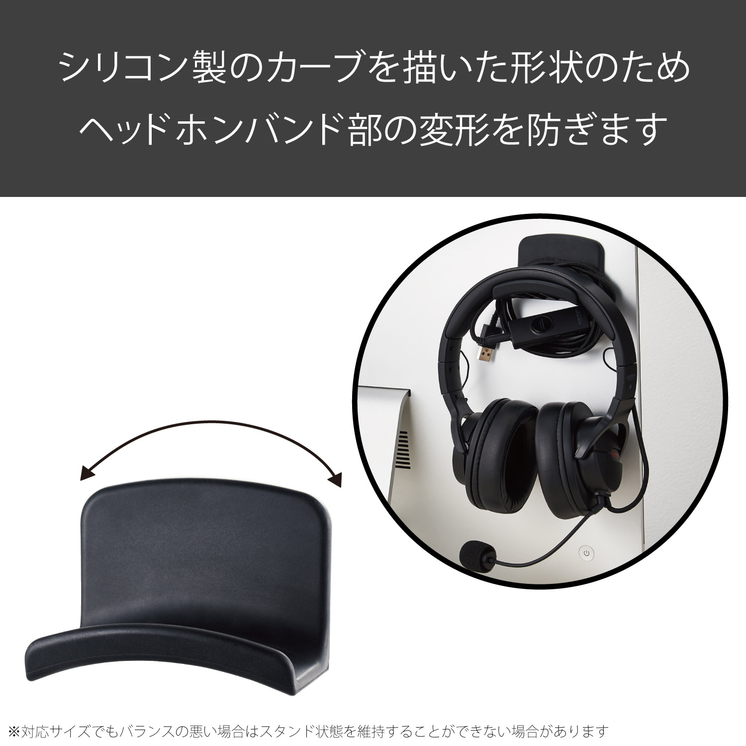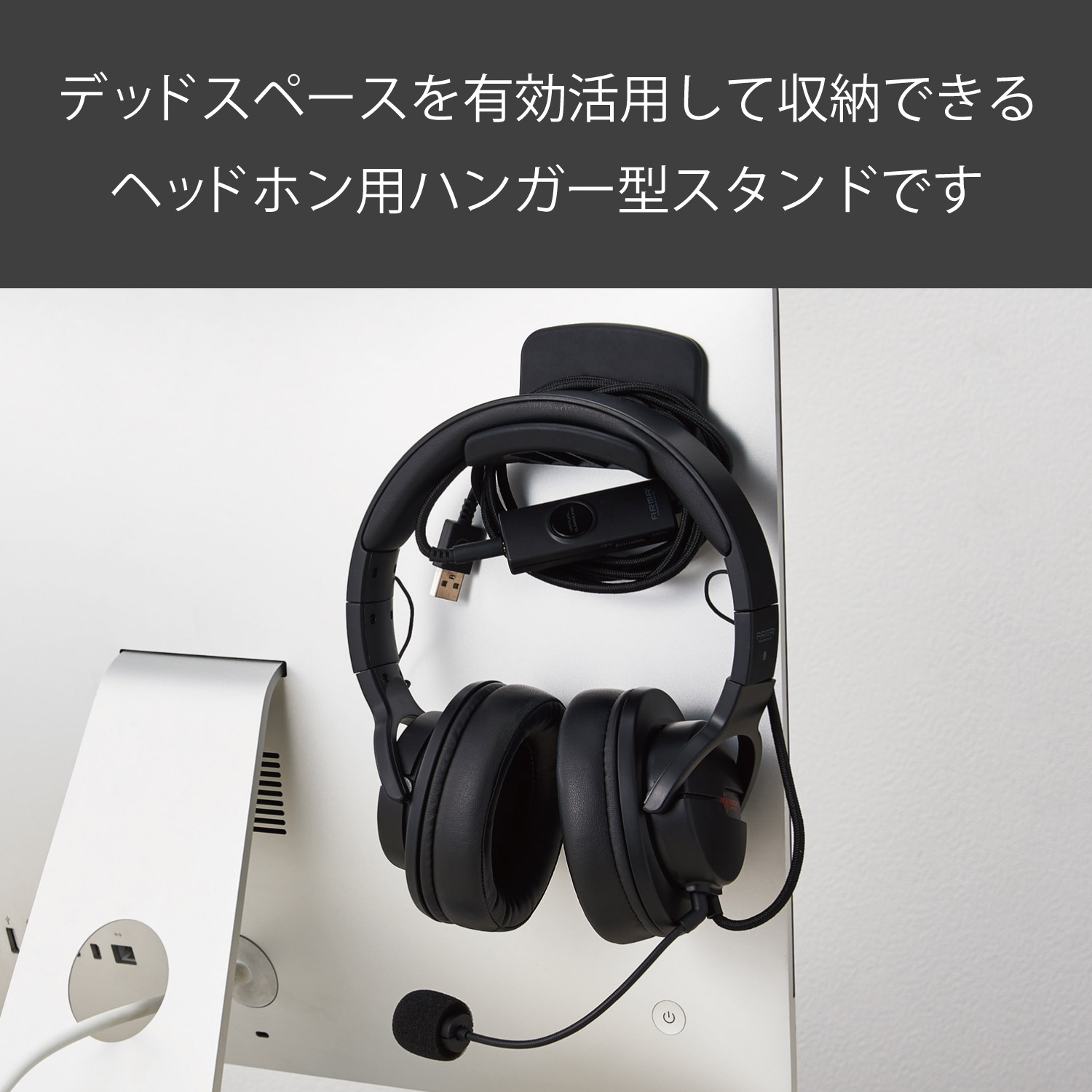 ディスプレイの背面などに貼り付け、デッドスペースを有効活用して収納でき、シリコン製のカーブを描いた形状でヘッドホンバンド部の変形を防ぐヘッドホン用ハンガー型スタンドです。