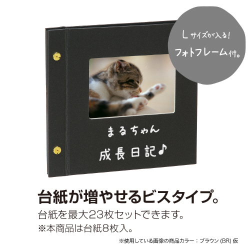 <表紙にフォトフレーム付> L判写真を表紙のフォトフレームポケットに収容することができます。