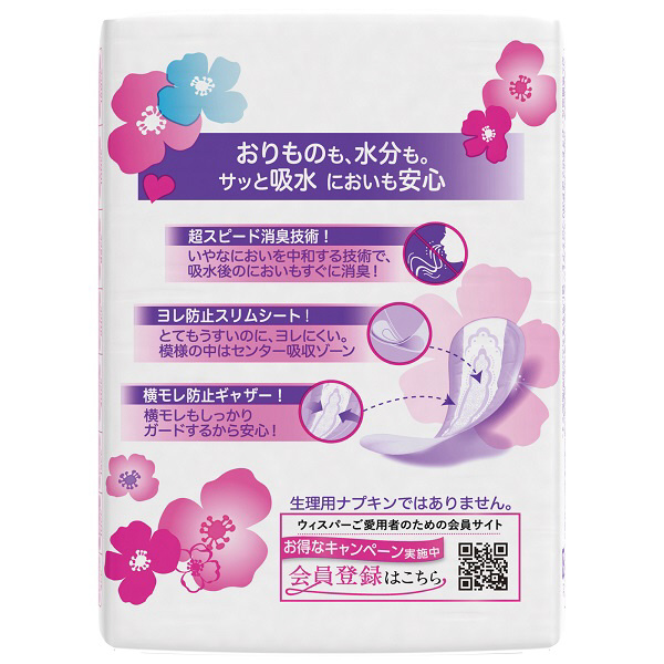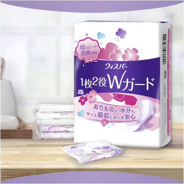 ウィスパー1枚2役Wガード※この商品は、おりものと尿との2つのケアを一緒にされる方のための商品です。生理用ナプキンではありません。おりものも、水分も。サッと吸水 においも安心超スピード消臭技術さわやかな香りヨレ防止スリムシートで、とてもうすいのに、ヨレにくい。模様の中は センター吸収ゾーン吸水ケア、パンティライナー、にょうもれパッド女性用、吸水ナプキン