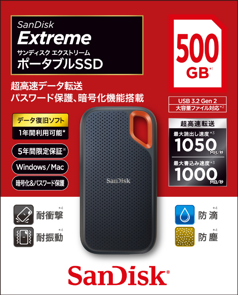 SDSSDE61-500G-J25 外付けSSD USB-C+USB-A接続 Extreme Portable SSD ブラック [500GB /ポータブル型] 【864】