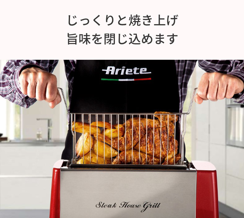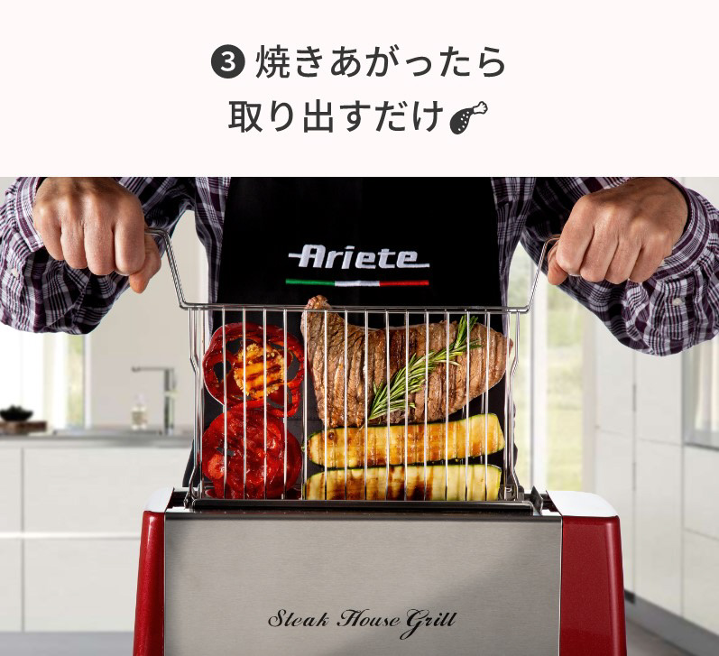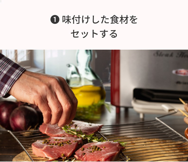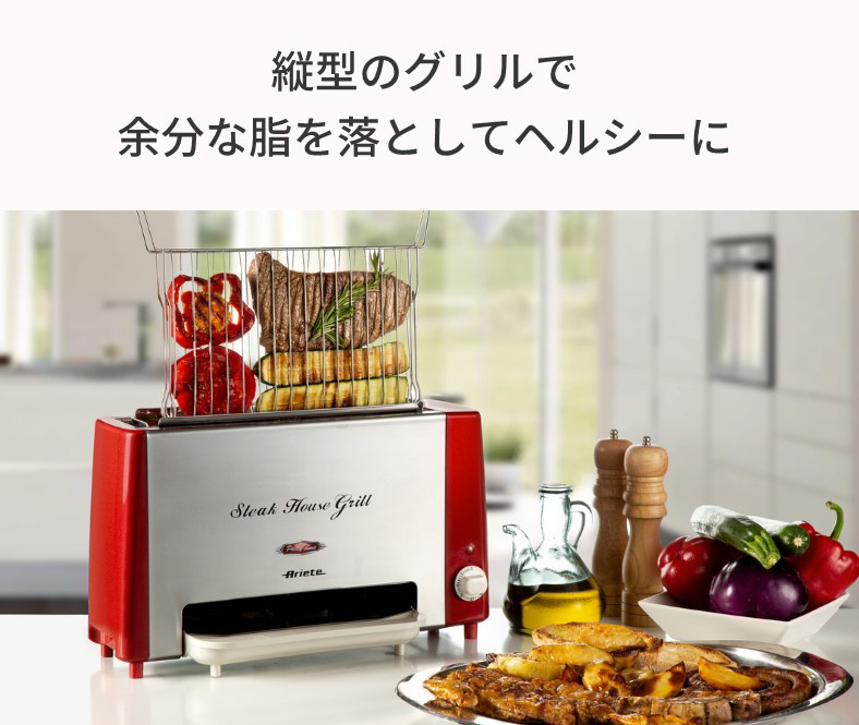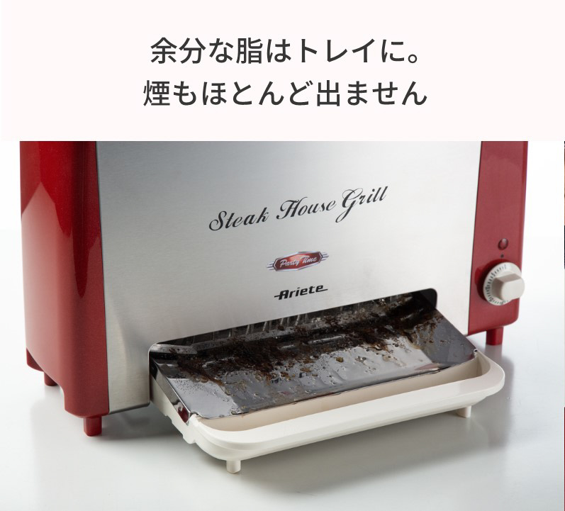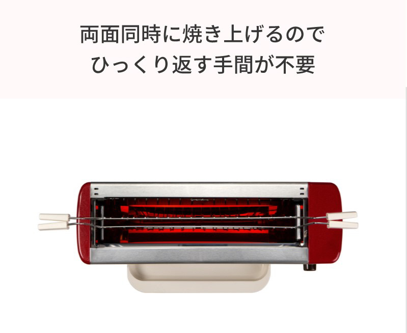 縦型グリルなので、余分な脂が下に落ちる設計。両面同時焼き上げでひっくり返す手間いらず。発熱部に素材が直接触れず油分が下に落ちるため煙が出にくい。