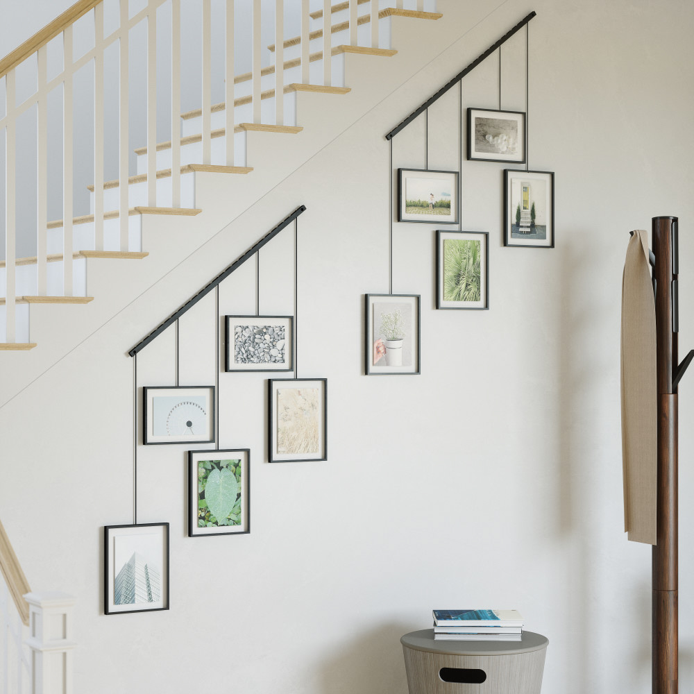イグジビット フォトディスプレイは、壁に専用のレールを取り付けるだけで、一度に5個のフォトフレームをディスプレイすることができます。レールに吊り下げる金属棒とフォトフレームは自由に組み合わせでき、フォトフレームは縦横どちらの方向にもセット可能。お好みのレイアウトを楽しむことができます。また、角度を付けて吊り下げることで、インパクトのあるディスプレイができます。エントランス、リビング、ベッドルーム、階段横、オフィスまたはショップなど、イグジビット フォトディスプレイはさまざまな場所を美しくデコレーションします。