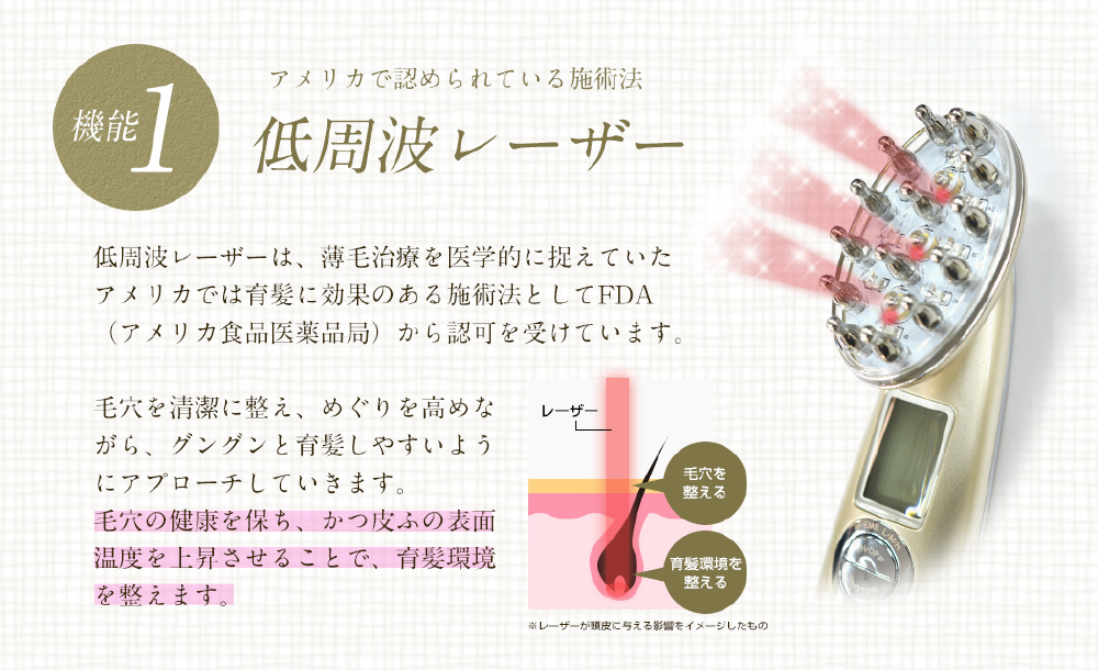 ■低周波レーザー・赤LDE・EMSの3機能で頭皮環境を整え、エレクトロポレーション・振動エステ・高周波の3機能で頭皮に潤い、髪にハリ・コシを与えます。