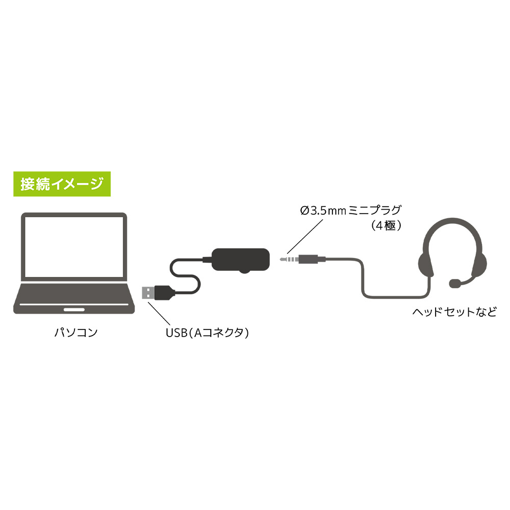 パソコンのUSB Aポートに接続して、3.5mmミニジャック(4極)に変換するアダプタです。