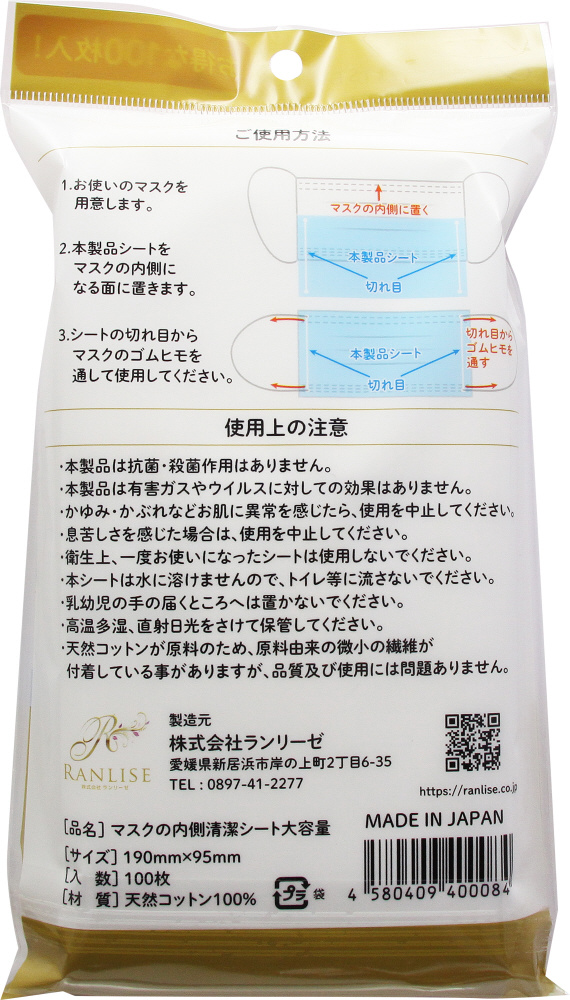 | 商品名 | マスクの内側清潔シート大容量 100枚入 |