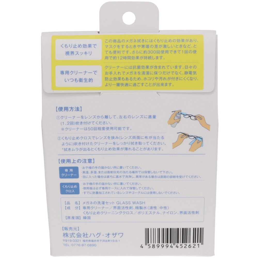 | 素材 | クリーナー:界面活性剤、精製水 くもり止めクロス:マイクロファイバー、界面活性剤 |