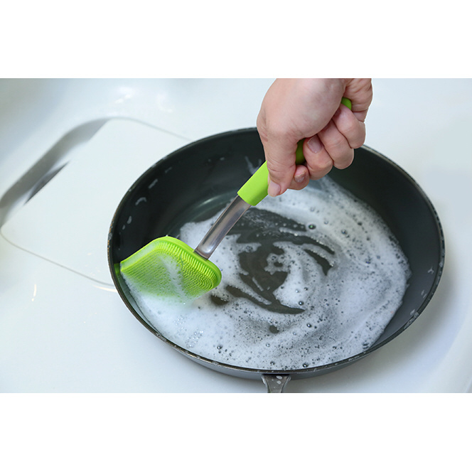 傷つきにくいシリコンブラシで、鍋やフライパン、食器などを優しく洗浄できる多用途ブラシ。
