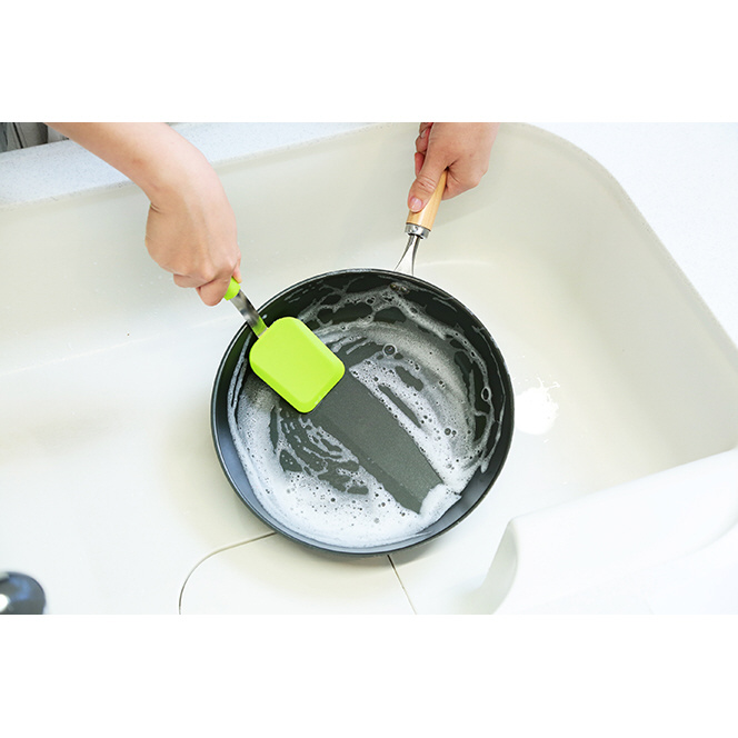 シリコンブラシが隅々までフィットし、傷つけにくく優しく洗浄できるフライパンブラシです。