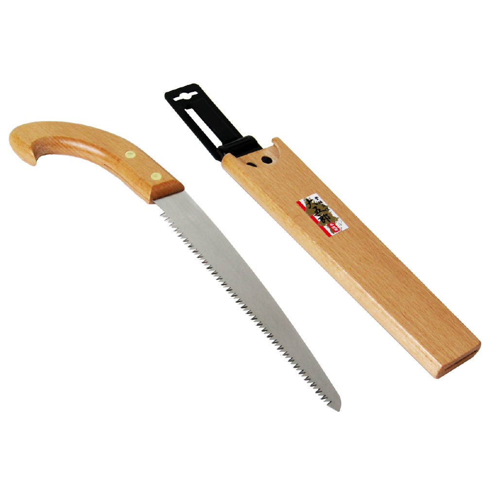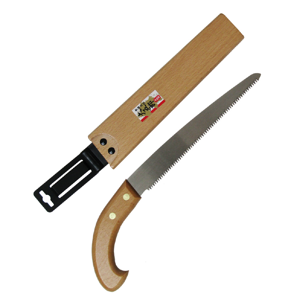 樹木、果樹の剪定に!。昔ながらの鞘入・木柄剪定鋸ですが、鋸刃は本職にも満足頂けますよう生木に最適な目立てを施してあります。腰に吊り下げできるサヤ付きなので携帯に便利です。