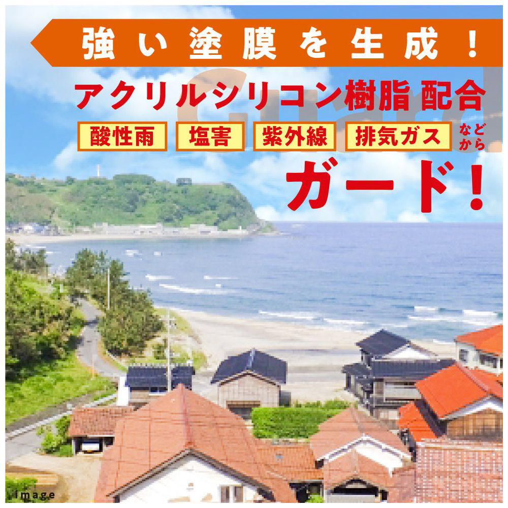 ●遮熱顔料と高耐久アクリル・シリコン樹脂配合のWブロック効果で、紫外線・排ガス・雪・酸性雨など外敵から建物を守り、長期間風合い・ツヤを保ちます。