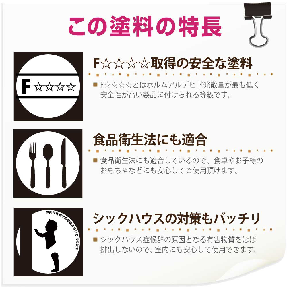 ●シックハウスに対応したF☆☆☆☆及び食品衛生法に適合した安全性の高い二スです。