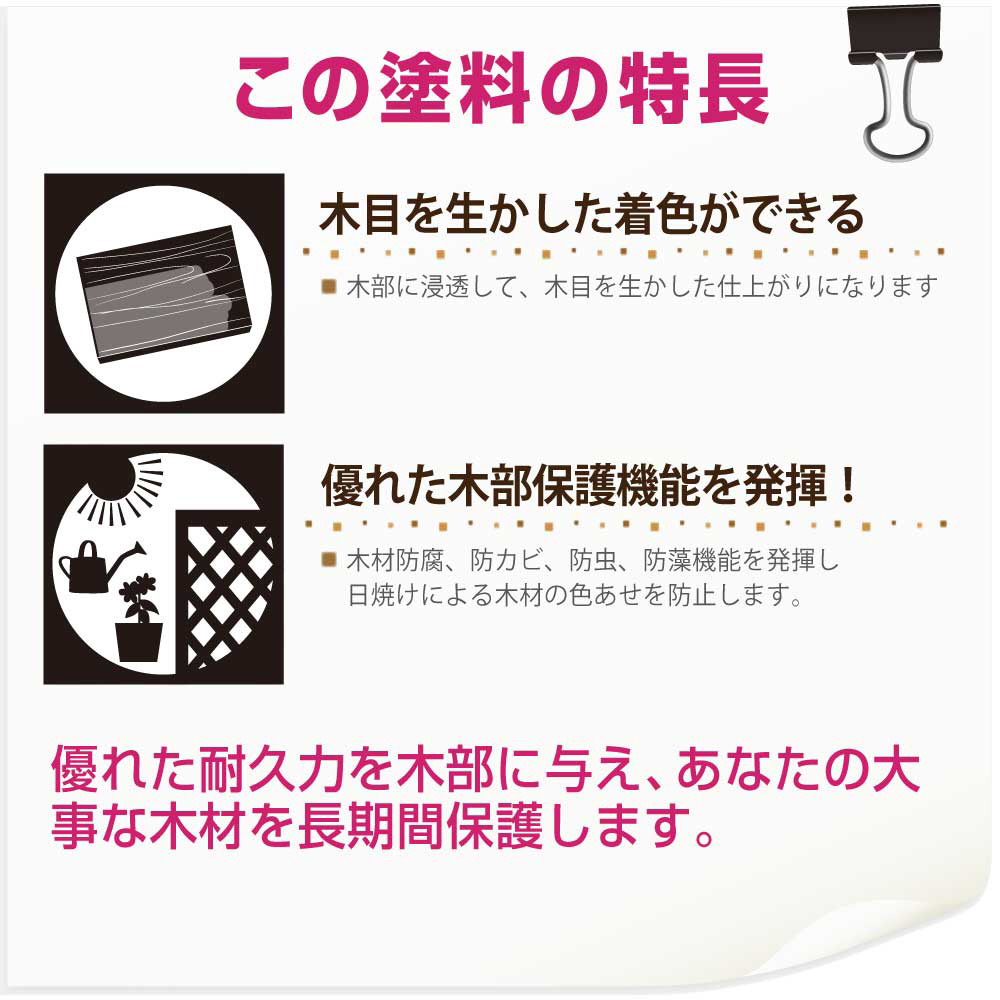 ●木材保護成分も配合されているので防虫・防腐・防カビ・防藻・UVカット効果を発揮します。