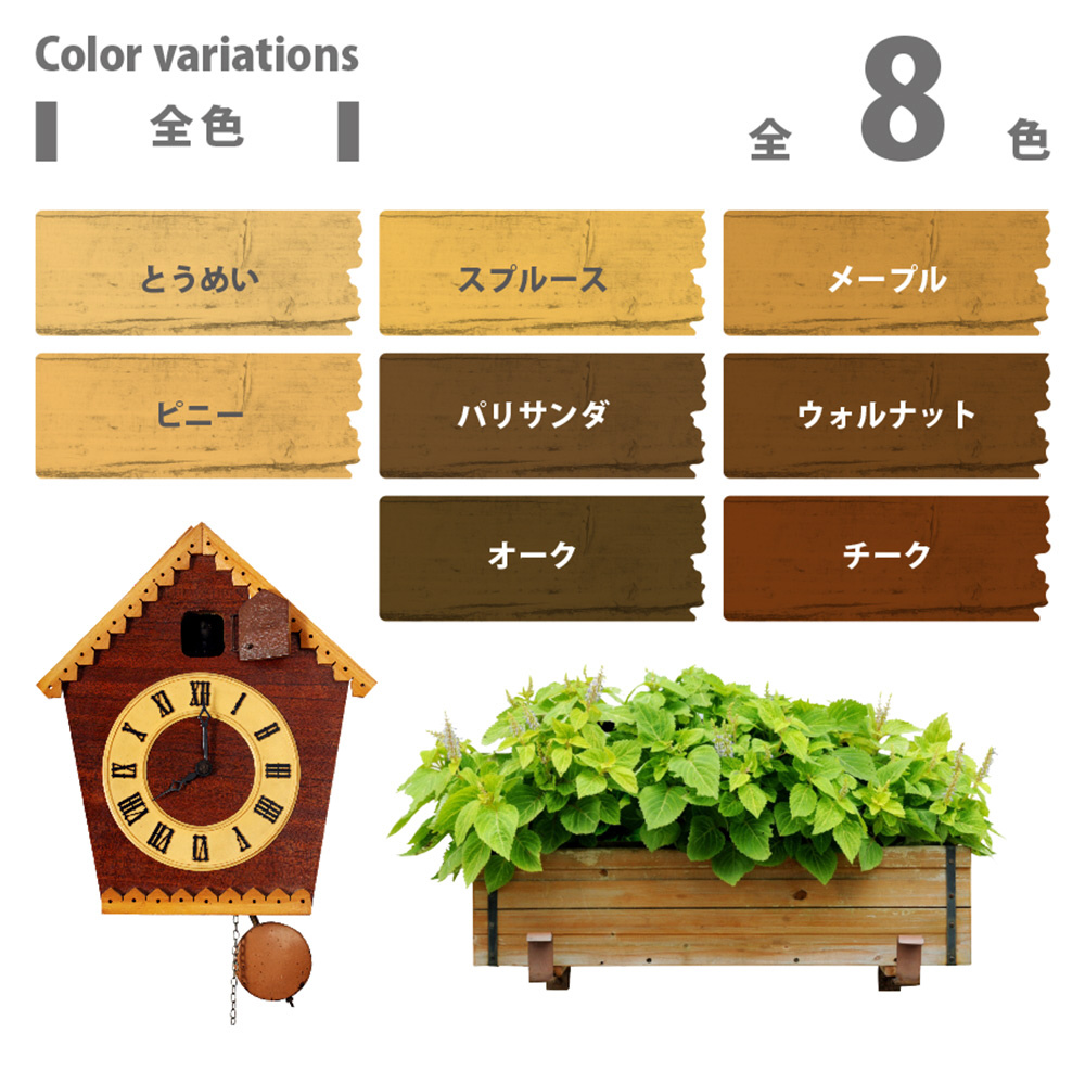 ●浸透性に優れ、耐久力が高い油性タイプ。保護効果が高いので傷みやすいウッドデッキや木製外壁などに適しています。【用途】屋外の木部(ウッドデッキ ラティス パーゴラ ベンチ ログハウス 羽目板 板へい)【塗れないもの】吸い込みのない木材(プリント合板・デコラ板)、常に水に浸かっている所、犬小屋・鳥小屋※塗装後も保護成分の臭いが若干残りますので、屋内木製品の塗装には不向きです。