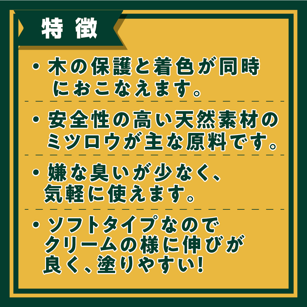 嫌なにおいが少なく気軽に使え、塗りこむことで木の保護と着色が同時におこなえます。