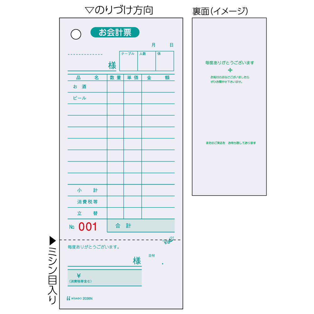 | 商品名 | 〔手書き用〕お会計票(領収証付)色上質 No.入 75×177 1P 2036N |