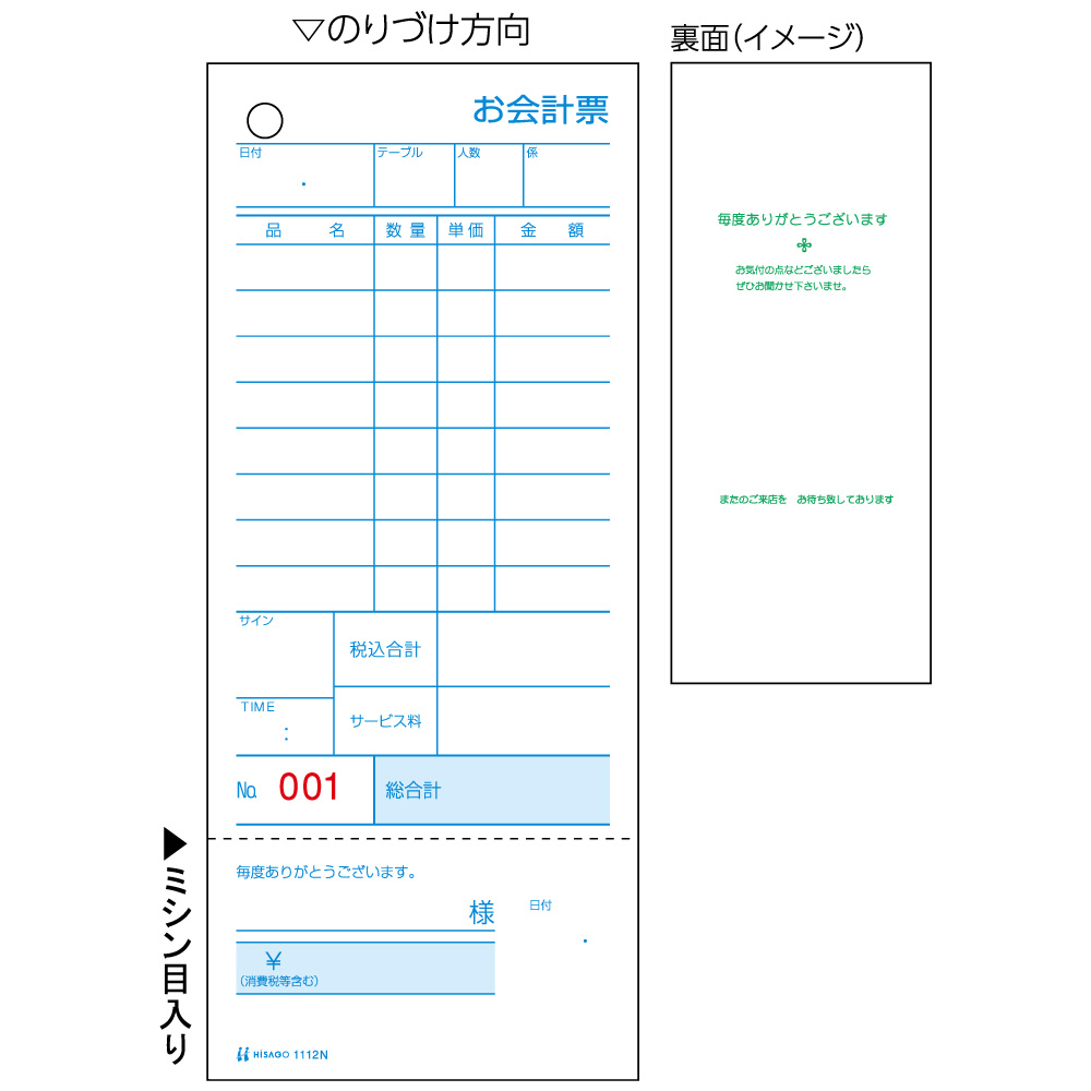 | 商品名 | 〔手書き用〕お会計票(領収証付)No.入 75×177 1P 1112N |