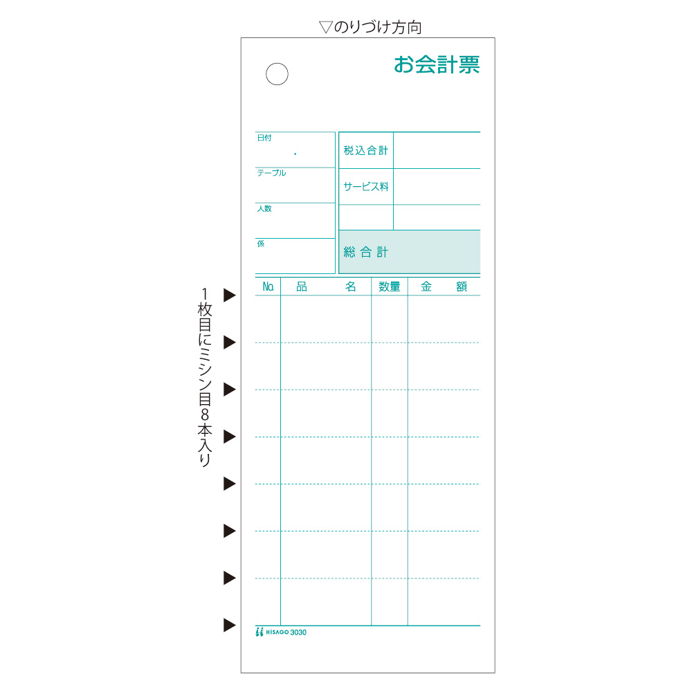 | 商品名 | 〔手書き用〕お会計票 ミシン8本入 70×175 2P 3030 |