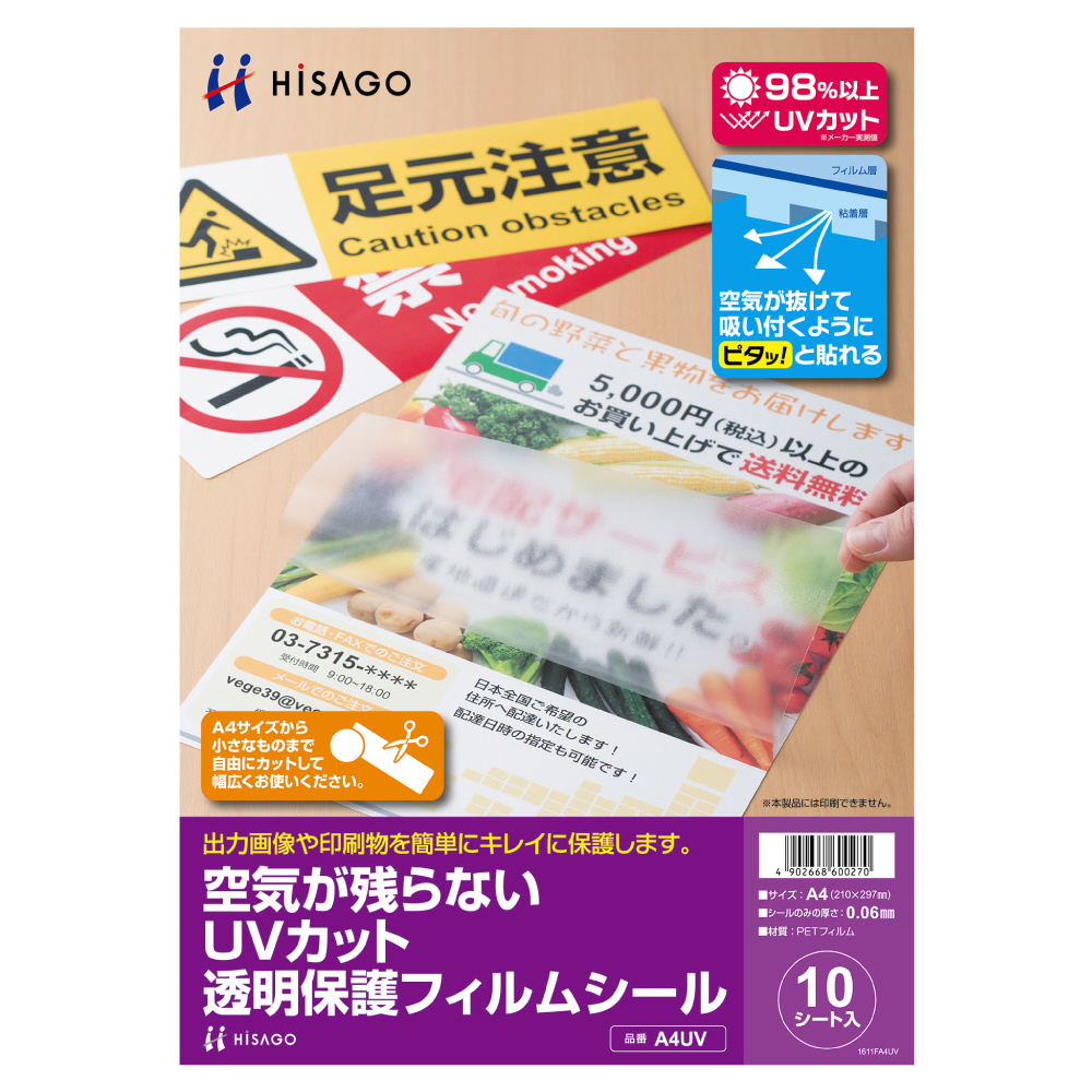 UV(紫外線)を98%以上カット!空気が抜けて吸い付くように貼れる透明保護フィルムです。印刷物の色あせを抑え、ツヤのある美しい仕上がりにします。剥離紙に特殊な加工をすることで、空気が抜けるノリ(強粘着)を実現!空気が抜けて吸い付くように簡単に貼ることができます。優れた耐水性で、水や油・ホコリを防ぎ、印刷面を保護します。A4サイズのノーカットタイプです。
