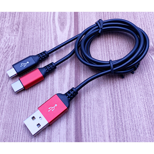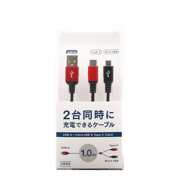 Type-C搭載の端末機器とmicroUSB搭載の端末機器を同時に充電することが出来るケーブルです。Type-C、microUSBを同時に充電する時は最大充電電流は各1.5Aです。Type-CまたはmicroUSBを単独で充電する時は最大充電電流は2.0Aです。※供給される電流値は、接続する充電器やパソコンによって異なります。※充電する端末に接続するコネクタ(Type-C又はmicroUSB)をAC充電器やDC充電器に接続しないで下さい。※当製品は充電専用ケーブルです。データ通信は出来ません。