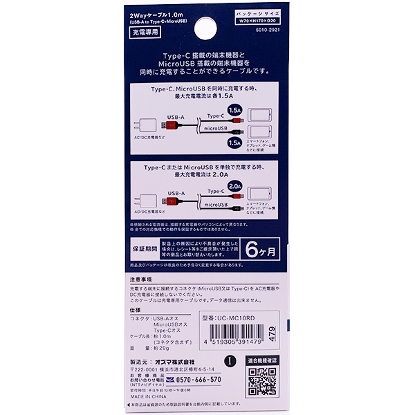 | 商品名 | [Type-C/microUSB] 2WAY充電専用ケーブル/1m レッド UC-MC10RD |
