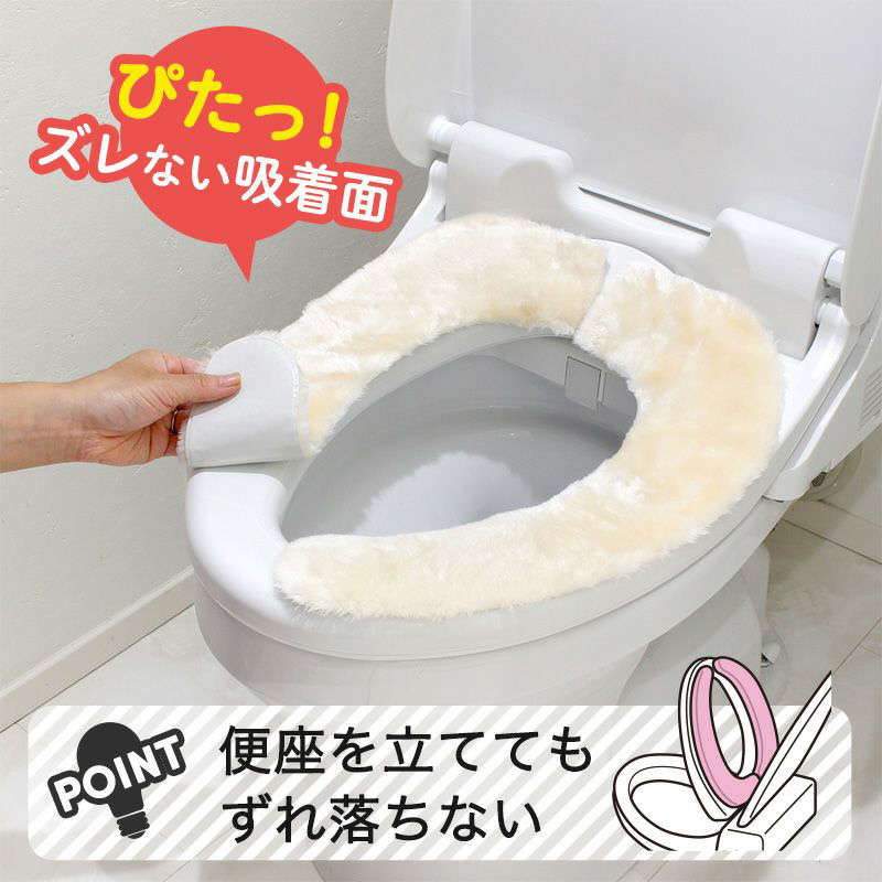 便座にのせるだけの簡単取り付け便座シートです。なめらかな肌触りとやさしくふわっとしたした弾力のボアタイプです。しっかりと吸着するので、便座を立ててもずれ落ちません。洗浄暖房型、O型、U型、ポータブル、どの便座にも対応できます。くり返し洗濯してご使用できます。洗浄便座の暖房を切って節電できます。厚さは約10mm。生地にボリュームがありすぎず、蓋がきちんと閉まります。