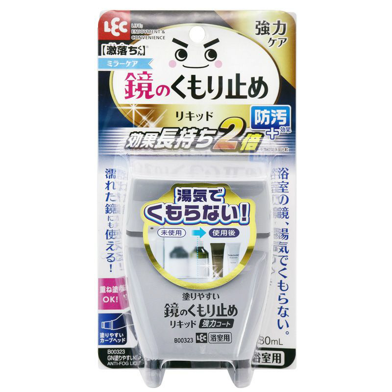 鏡に直接塗り広げる、リキッドタイプの強力くもり止めです。既存品の「塗りやすいくもり止めリキッド」と比較すると、約2倍長持ちし、さらに防汚効果も得られます。50cm×50cmの鏡に対して約40回ご使用いただけます。鏡の表面を濡らすことにより水の膜ができ、くもりを防ぎます。約20回分の入浴まで効果が持続します。塗りやすいカーブヘッドで濡れた鏡にも使え、重ね塗りもOKです