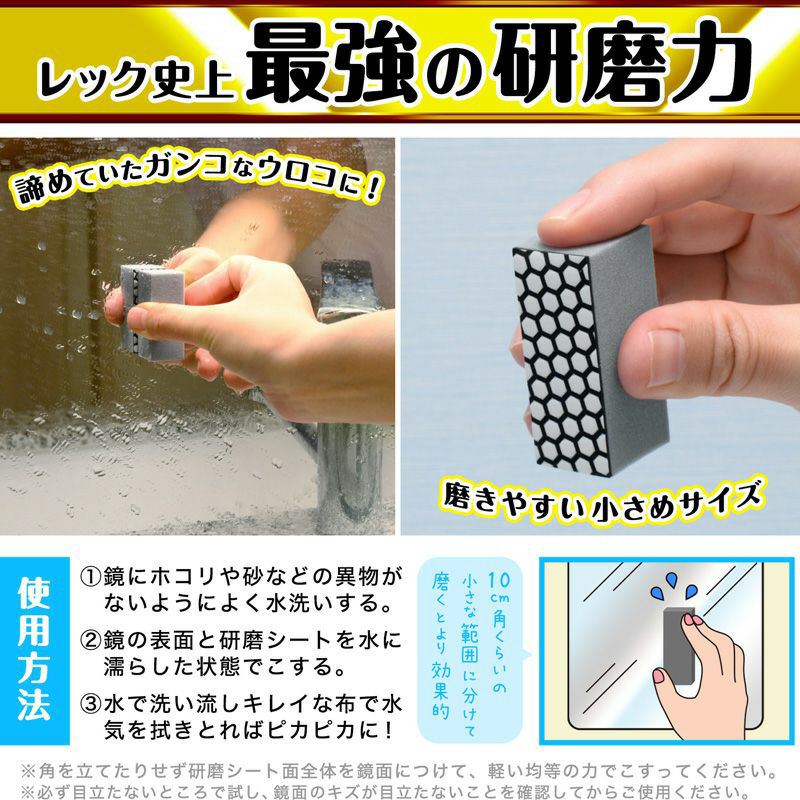 最硬質の研磨材「人工ダイヤモンド研磨粒子・20%増量」を使用したプロ仕様の特殊研磨スポンジ。レック史上最強の研磨力を持った激落ちくんのウロコ汚れ落としです。ウロコ・水アカ汚れを溶かす「フルーツMIX酸」を配合。酸が汚れを溶かして浮かすので、軽い力で落とし鏡をキズつけにくい。握りやすいグリップで浴室鏡のガンコなウロコ汚れ(鱗状痕)を、水をつけてこするだけで簡単に落とします。くり返し使えるので経済的です