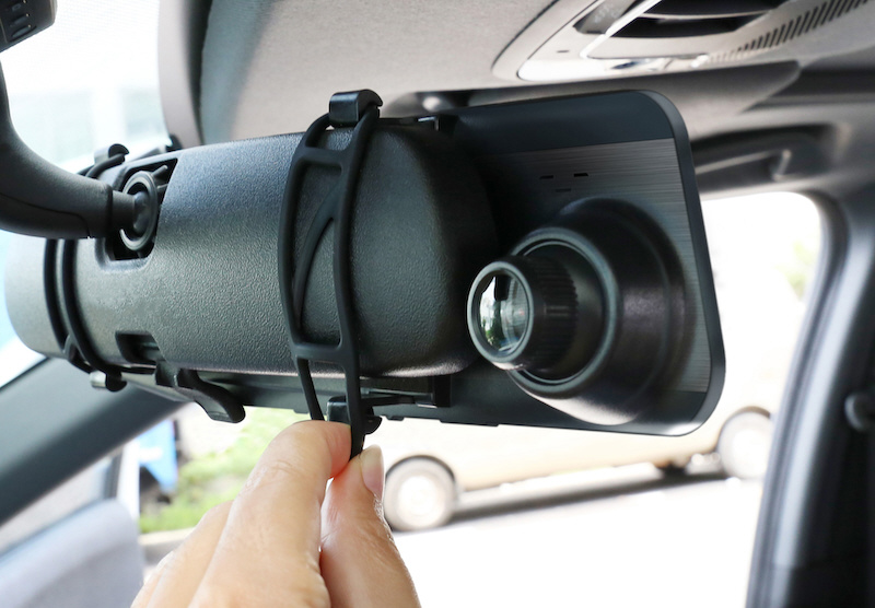 これまで視界の妨げになっていたフロントガラスに取り付けるモデルに対して、本製品はミラー型のカメラ本体をゴムバンドでルームミラーにかぶせて取り付けができ、視界を良好にすることを実現しました。