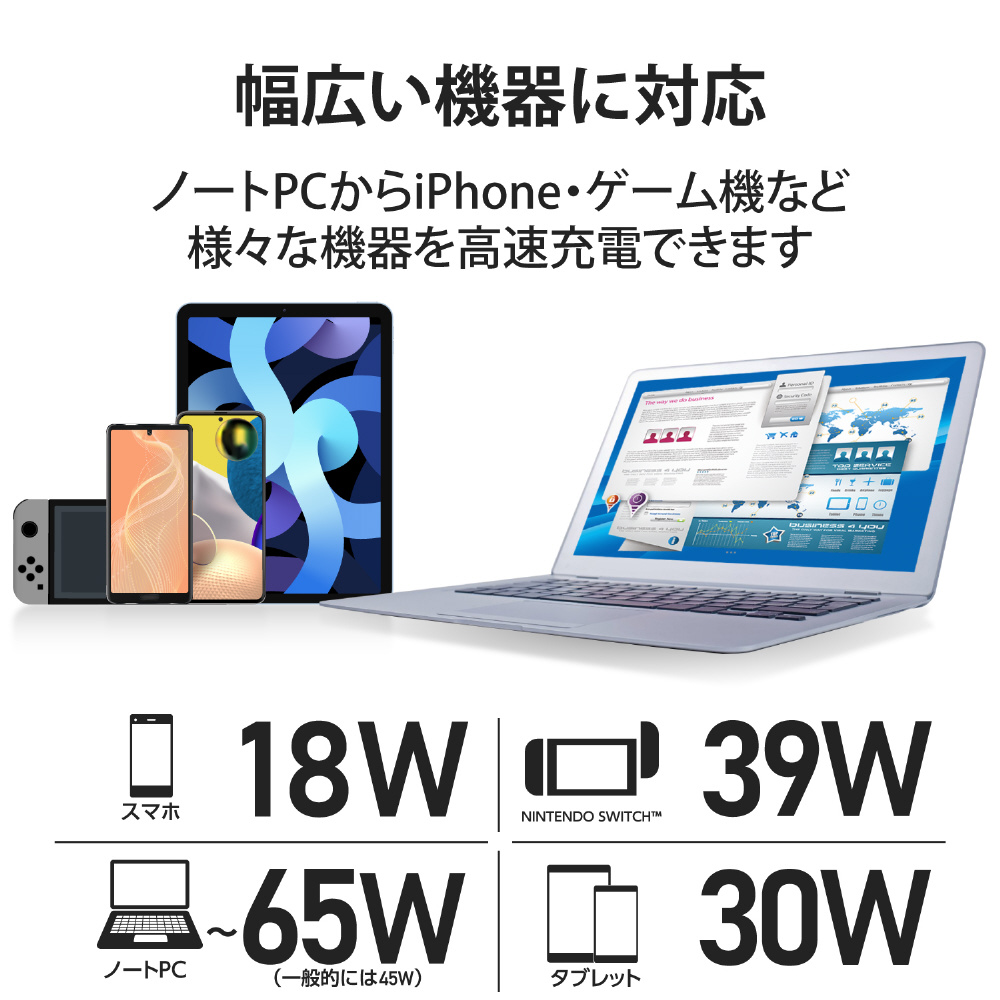 GaN(窒化ガリウム)を採用した小型で軽量、かつ高出力なUSB AC充電器です。Power Deliveryに対応し、USB Type-C(USB-C)コネクタを搭載したPD対応ノートPCやスマートフォン、タブレットなどを超高速充電が可能です。※本製品のPower Delivery最大出力は65Wです。